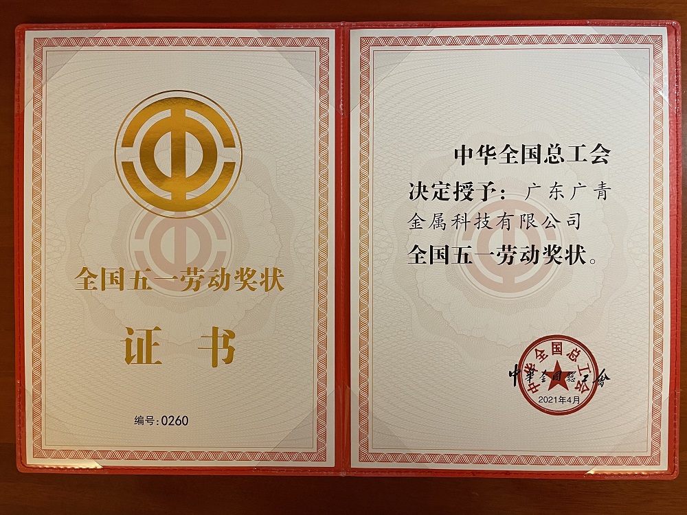 4月27日上午,2021年庆祝“五一”国际劳动节暨“建功十四五 奋斗新征程”主题劳动和技能竞赛动员大会在北京人民大会堂隆重举行,表彰了先进集体和先进个人。广东广青金属科技有限公司荣获“全国五一劳动奖状”荣誉称号。