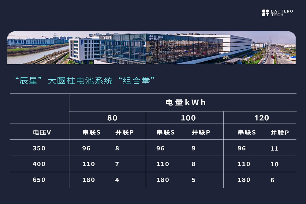 更进一步,兰钧依托大圆柱电芯标准化、平台化优势,可基于同款容量规格电芯,匹配不同电量(80kWh~120kWh)、电压平台(350V/400V/650V)需求,做到一款电芯满足多个客户需求,从而降低电芯成本。