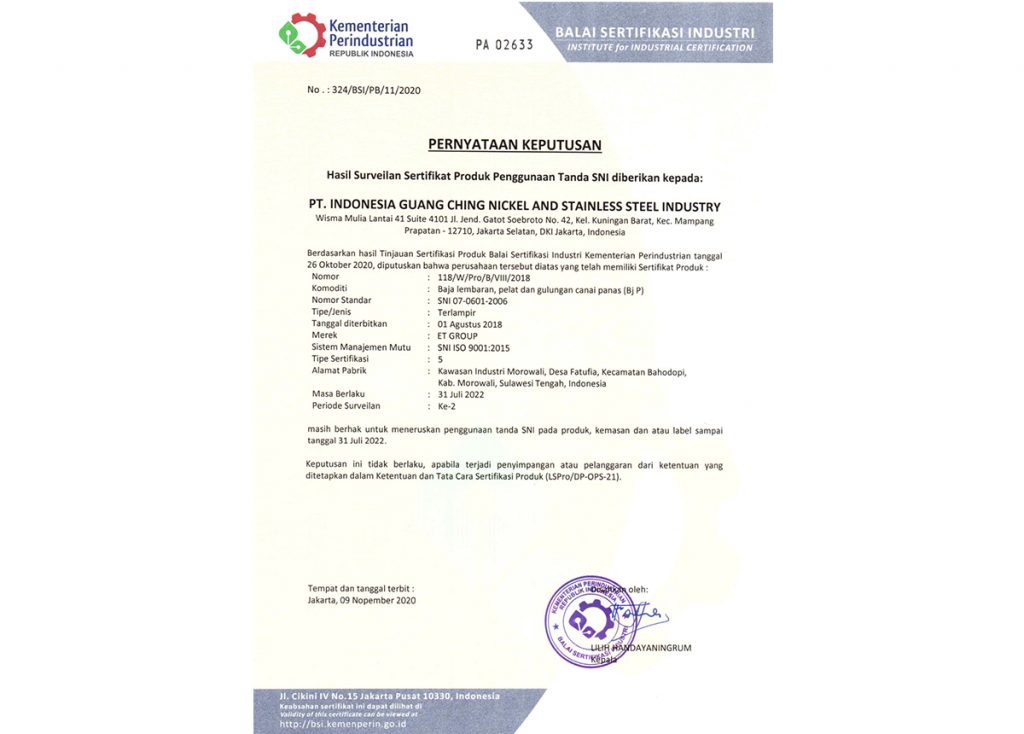 11月10日下午,印尼广青镍业有限公司(GCNS)获得了印尼工业部颁发的印尼语版SNI认证更新证书。此次认证的产品范围是碳素钢热轧钢带的生产和服务。