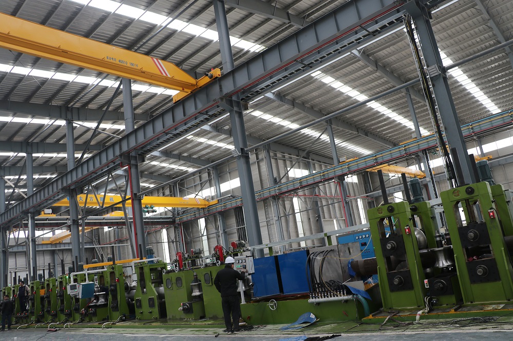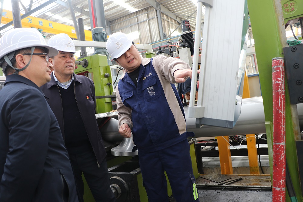 曾智勇一行还亲赴园区浙江J9国际集团钢管有限公司参观了焊管车间,了解企业工艺和设备情况。在仔细聆听车间主任对生产工艺流程及流水线设备的介绍后,曾智勇连连点头给予肯定。