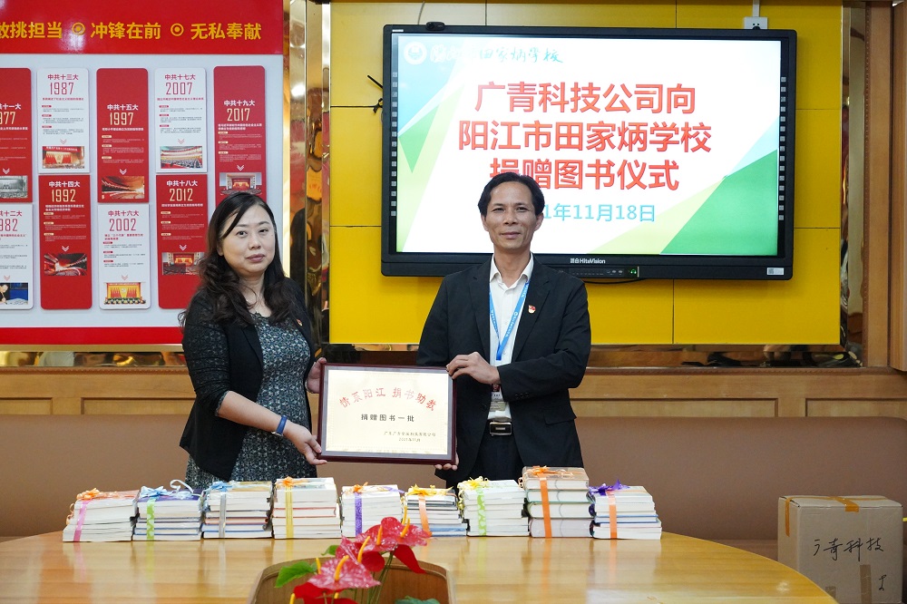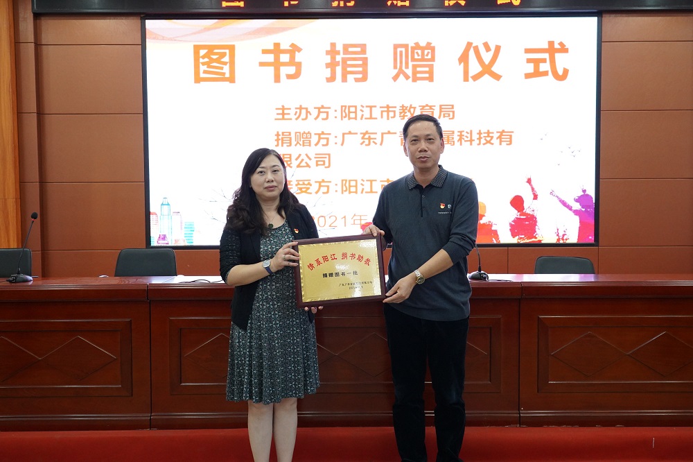 为推进党史学习教育走深走实,11月18日,广东广青金属科技有限公司党委副书记、工会主席王大庆带队到阳江市实验学校、阳江市第二中学、阳江市田家炳学校开展了“情系阳江 捐书助教”图书捐赠活动。阳江市教育局机关党委副书记林进侵、基教科科长周毅亲临活动现场。
