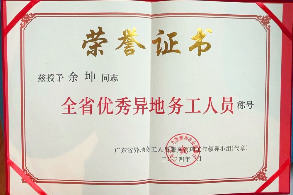 余坤表示:“阳江是一座包容和温暖的城市,作为一名外来务工者,不仅感受到了政府对我们的关怀,也感受到了企业给予我们的关爱。此次获评广东优秀异地务工人员,这既是对我的一种鼓励,也是对我的一种鞭策,我将继续做好本职工作,发挥自己的一技之长,为公司高质量发展贡献力量。”