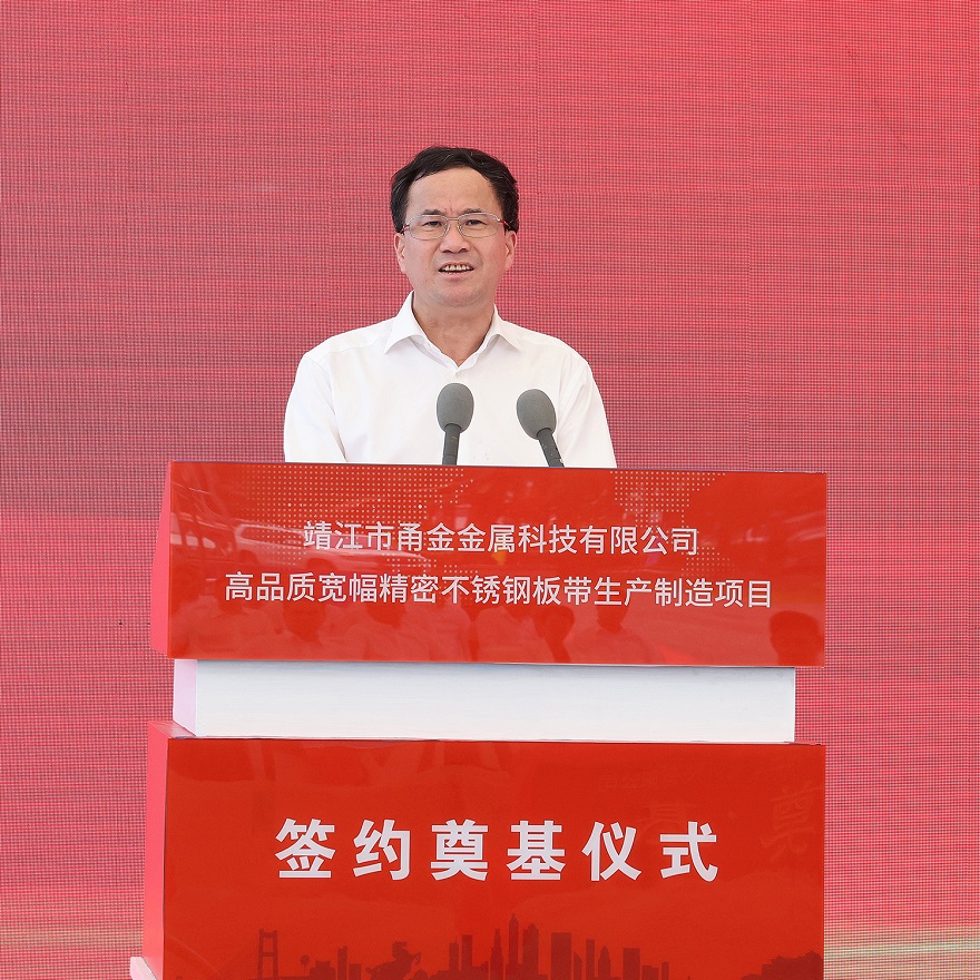 靖江市委常委、经济技术开发区党工委副书记张劲松介绍了项目情况,他指出:靖江甬金项目总投资20亿元,用地271亩,计划建设年加工120万吨高品质宽幅不锈钢冷轧钢带生产基地;靖江开发区将以最大的诚意尽最大的努力,以最优质的服务、最优秀的政策、最优良的环境助力项目高效的推进、高标准建设,真正让企业投资放心、创业舒心、发展安心。
