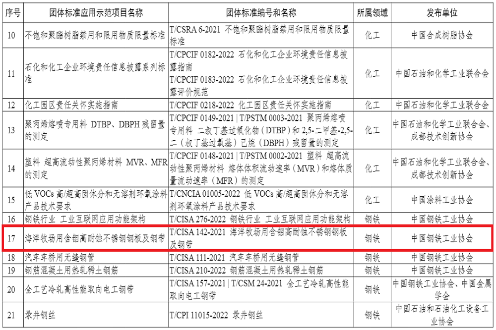 为深入贯彻落实《国家标准化发展纲要》,大力发展团体标准,推进团体标准应用示范,自2022年开始工信部每年评选百项团体标准应用示范项目。两年以来中国钢铁工业协会共有10项团体标准入选,其中青拓集团有限公司和冶金工业信息标准研究院等单位联合编制有关QN系列不锈钢产品的标准有三项,占比达30%,在工信部百项团体标准入选项目数上处于行业领先水平。这三项标准分别是T/CISA 045-2020《铬-锰-镍-氮系奥氏体不锈钢热轧钢板和钢带》、T/CISA 046-2020《铬-锰-镍-氮系奥氏体不锈钢冷轧钢板和钢带》和T/CISA 142-2021《海洋牧场用含钼高耐蚀不锈钢钢板及钢带》。