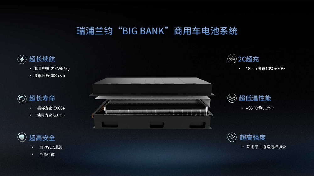 瑞浦兰钧“BIG BANK”在长续航方面性能优异,商用车电池系统能量密度超过210Wh/kg,系统可支持重卡车型续航里程突破500km。除此之外,在快充、安全、低温性能以及循环寿命等方面也不可小觑。该系统具备2C快充性能,18min可实现10%-80%快速补电,有效提升运营效率;具备主动安全监测功能,并可防止热失控蔓延;在先进的热管理技术赋能下,可实现-35℃稳定运行;循环寿命高达5000次以上,使用寿命超10年。