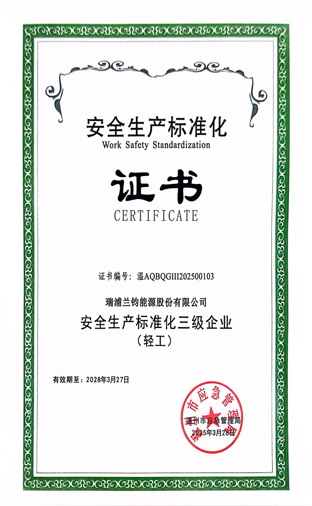 国家安全生产标准化认证是衡量企业安全管理的重要依据。三级认证需满足13项核心要素、138项评审细则,涵盖安全责任体系、设备设施管理、隐患排查治理、应急救援等全流程。瑞浦兰钧(温州基地)均达到国家三级安全生产标准化要求,展现了企业规范化的安全管理能力和对员工安全健康的高度重视。