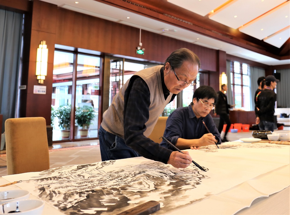 林子利一行在水上会议厅开始实地创作。浓墨勾勒、淡墨烘托、轻彩渲染,从郁郁葱葱的松树到远处的山、房屋、青色绸缎似的江面,虚实结合一点一点描绘一幅完整的山水画,展现中国画的独特韵味。