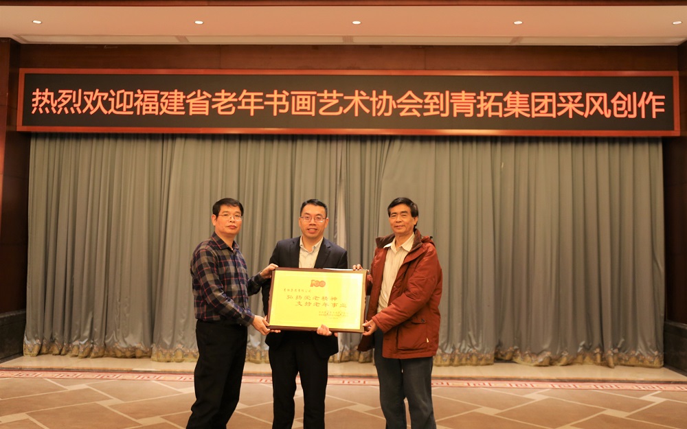 最后,福建省老年书画艺术协会为青拓集团颁发“弘扬爱老精神 支持老年事业”铜匾,并将创作的作品及带来的书籍赠送给青拓集团。