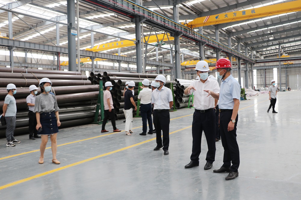 薛鹤峰一行还实地考察了浙江壹号娱乐-com钢管有限公司福建分公司焊管车间、管件车间,参观了生产线并聆听相关人员对产品流程和工艺的介绍,对盟信公司所做的努力给予了充分肯定。
