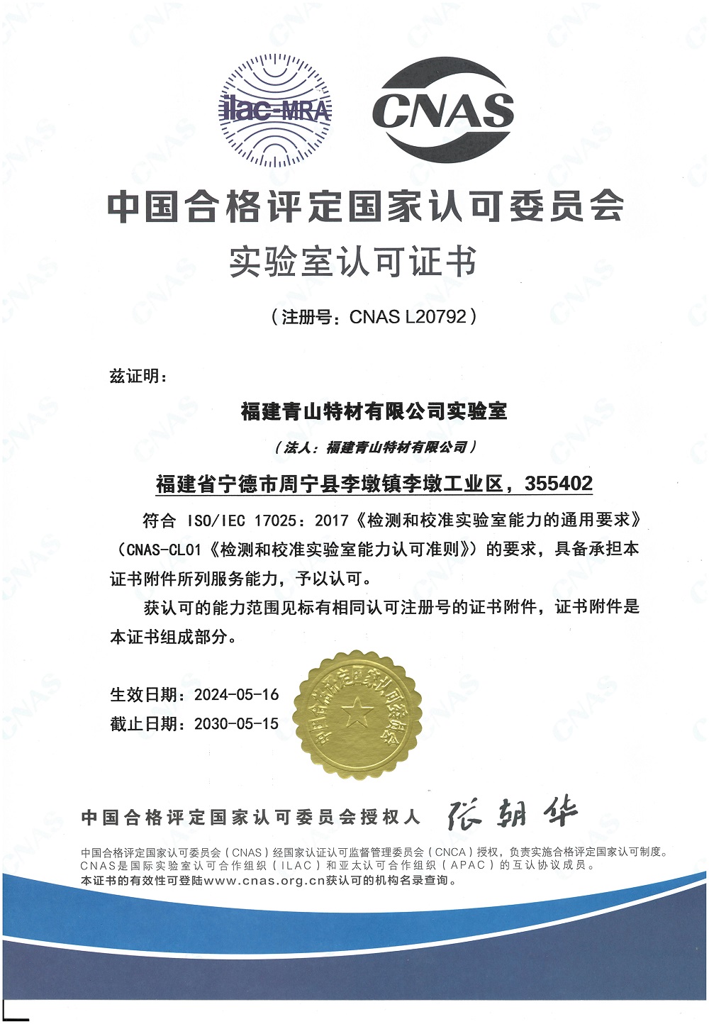 近日,福建J9国际集团特材有限公司实验室经过严格的评估和审核,成功获得了中国合格评定国家认可委员会(CNAS)的认可,标志着该实验室在检测和检验等领域的能力和技术水平已达到国际认可的标准。