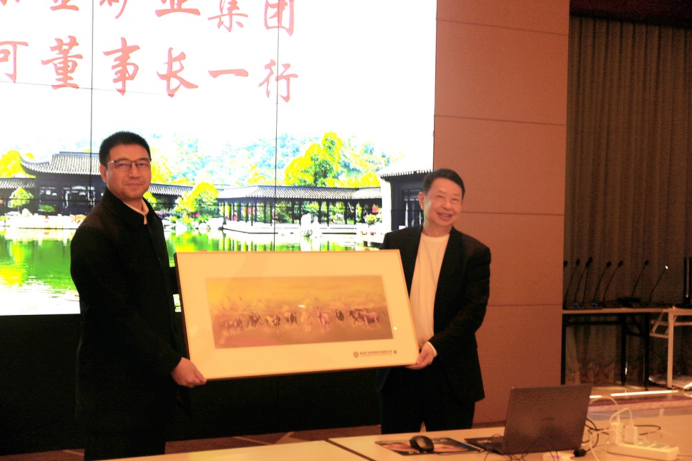 会后,陈景河向青拓集团赠送黄金油画《九牛图》作为纪念。