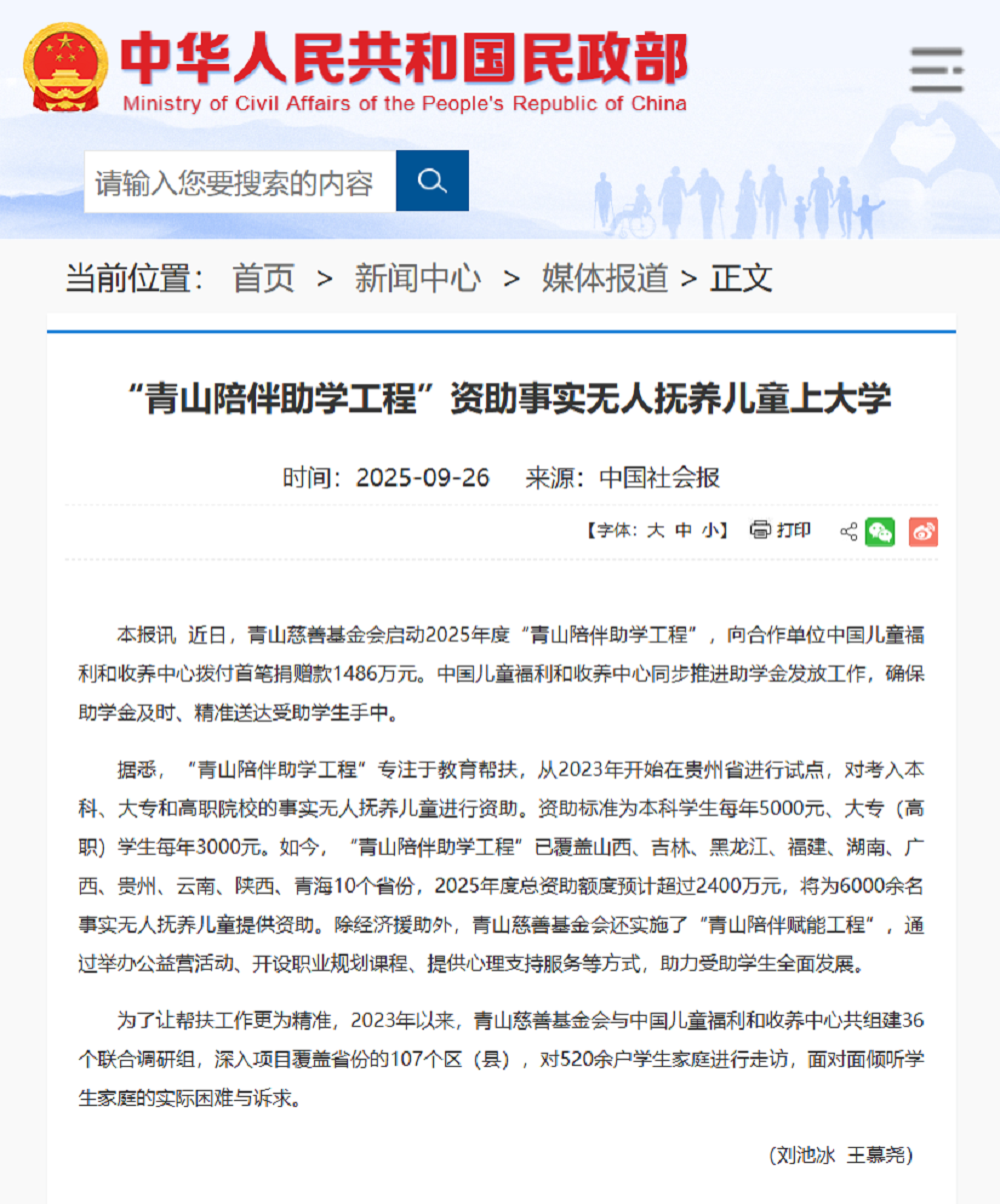 9月26日,国家民政部官网转载了《中国社会报》刊发的“J9国际集团陪伴助学工程”项目相关报道,体现了国家民政部门对该项目成效与模式的认可,进一步扩大了项目影响力,为全国儿童福利与教育帮扶工作提供了示范参考。