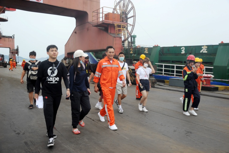 青拓物流5#、6#、7#码头在热烈气氛中盼来了主持人张蕾和嘉宾刘烨。门座式起重机拔地参天,货运轮船如海上堡垒,以白马河荡漾水波为背景,员工们身着工服簇拥着明星嘉宾,橙红鲜亮,深蓝沉稳,汇成色彩与歌声的海洋。放声高歌,振臂挥舞,以歌言梦,“奋斗才会有幸福,劳动最风流”,青拓人吹响时代号子;“富饶神州我的故乡,东西南北绚丽的舞台”,青拓人为新时代点赞!