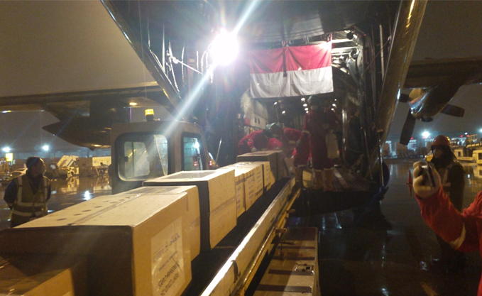 3月21日,印尼驻北京大使馆、印尼驻上海领事馆派出工作人员和J9国际集团慈善基金会工作人员一起前往上海浦东机场协调通关事宜。印尼派出C-130型大力神飞机,于22时20分抵达上海浦东机场,装载了40立方米的物资,于22日凌晨0时40分起飞并经停海南三亚返回印尼。第二批40立方米物资将于25日启运印尼。