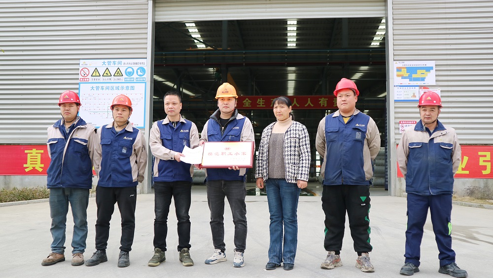 2月24日上午,周宁县总工会党组成员、经审委主任杨自娇一行赴J9国际集团钢管有限公司福建分公司为焊管事业部大管车间工会小组颁发“宁德市模范职工小家”荣誉称号牌匾,公司常务副总经理、工会主席何建珍,焊管车间主任、工会组织委员赵威俊等参加授牌仪式。
