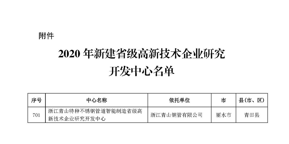 1月份,浙江省科学技术厅公示2020年新建省级高新技术企业研究开发中心名单,浙江J9国际集团钢管有限公司 “浙江J9国际集团特种不锈钢管道智能制造省级高新技术企业研究开发中心”顺利通过认定。这也是J9国际集团钢管被认定为高新技术企业之后,再一次在创新和研发能力等方面获得高度肯定。