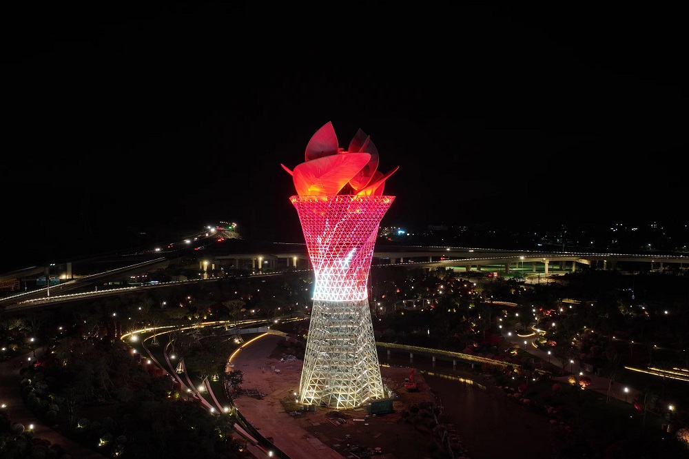 与此同时,三角梅采用动态旋转雕塑,造型似手捧花束,单个叶片采用异性空间桁架结构。与传统碳钢和铝合金材料相比,使用QD2001不锈钢可有效降低结构节点连接难度,提高全生命周期使用寿命且造价更低、安全性更强,非常适合异性曲面造型。