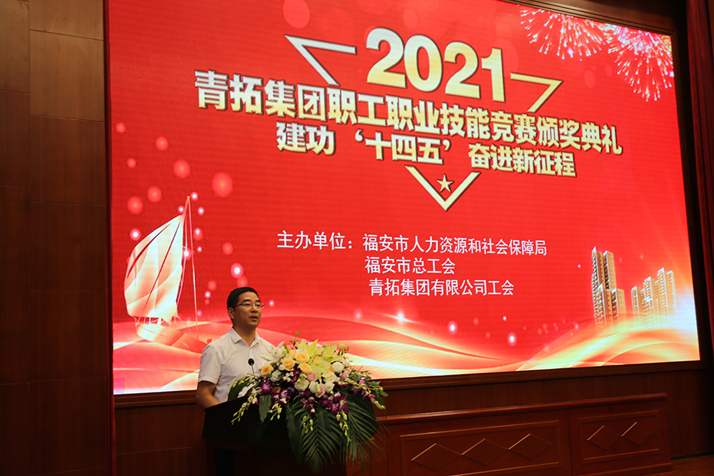 颁奖典礼上,苏振铃发表讲话,他指出:青拓集团克服新冠肺炎疫情和国际形势带来的不利影响,迎难而上,大力做好企业复工复产,稳定就业,保持了企业平稳发展,这既凝聚着广大企业职工辛勤劳动的智慧和汗水,也诠释了企业和职工是荣辱与共的命运共同体,举办职工职业技能竞赛,促进了一大批优秀技术工人脱颖而出,极大地激发和调动了企业职工建功立业的劳动热情和创造伟力。他强调:我们要大力弘扬劳模精神、劳动精神、工匠精神,发挥高技能人才的“传、帮、带”作用,做好“师带徒”工作,走技能成才、技能报企之路,着力培育和打造一支遵章守纪、爱岗敬业、技能精湛的新型产业工人队伍;我们要更加紧密地团结在以习近平同志为核心的党中央周围,高举习近平新时代中国特色社会主义思想伟大旗帜,以只争朝夕、勇于拼搏,勤于创造、勇攀高峰的精神,奋力谱写全面建设社会主义现代化国家福安篇章。