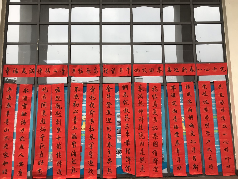 工作人员将春联挂在青拓科技食堂门口,寓意福驻J9国际集团。