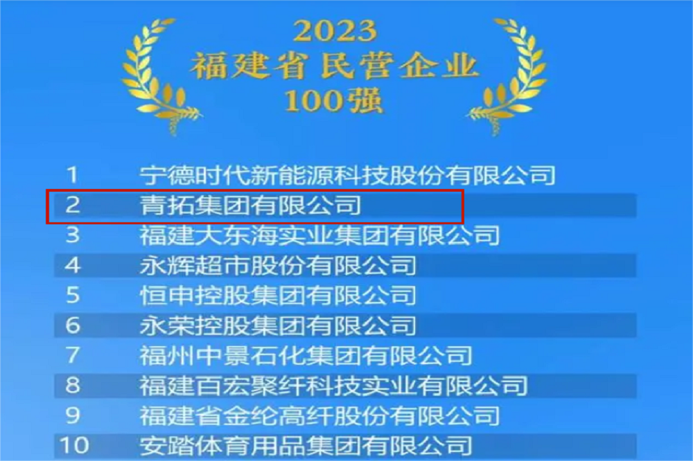 9月19日,福建省工商联发布2023福建省民营企业100强、2023福建省制造业民营企业100强、2023福建省创新型民营企业100强、2023福建省服务业民营企业100强4个榜单,这是福建省工商联连续第6年发布福建省民营企业100强榜单。青拓集团有限公司荣获2023年福建省民营企业100强第二名、福建省制造业民营企业100强第二名。