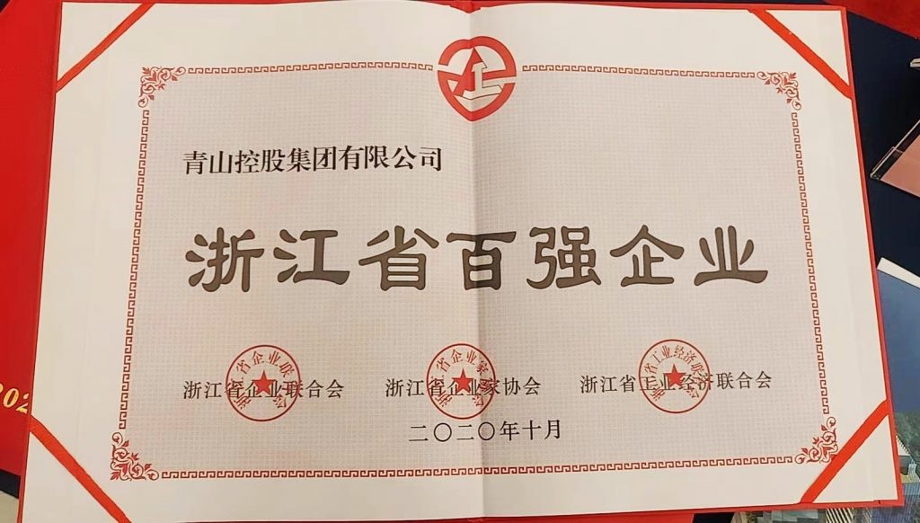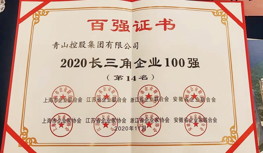 On December 18, the 8th Member Representative Conference and “2020 Zhejiang Enterprise Leaders Summit” hosted by Zhejiang Enterprise Confederation, Zhejiang Entrepreneur Association, and Zhejiang Industrial Economic Federation were held in Hangzhou. A series of lists of 2020 Zhejiang Top 100 Enterprises, Top 100 Manufacturing Enterprises, and Top 100 Enterprises in the Yangtze River Delta were released at the meeting. Tsingshan Holding Group Co., Ltd. ranked 4th among the top 100 enterprises, and 2nd among the top 100 manufacturing enterprises in Zhejiang Province in 2020, 14th among the top 100 enterprises in the Yangtze River Delta and 5th among the top 100 manufacturing enterprises.